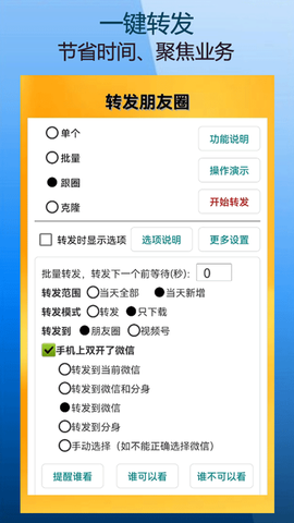 1、突破传统手动操作限制,实现单条朋友圈图文/视频的瞬时转发